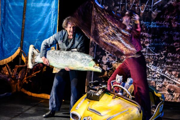 Djur intar scenen, och tvåbeningarna (människorna) har inte huvudrollen. Masker och dockor känns berörbara och fyllda av magisk kraft. Jag känner igen det som sker utifrån mina egna barns intensiva lekar med gosedjur. Fantasivärldarna som bearbetar aktuella, märkliga och ibland hemska saker från verkligheten. I mitten på scenen står en havererad radiobil, kraschad i skogen, drunknad i havet, kvarbliven på en i övrigt utbombad jord. Mörker och ljus, musik, och aktörernas fysiska spel, skapar en sublim humor, som får skratt att bubbla fram. Jordens-undergång-teman, tids-resefilmer med maskinmagi, och Harry Potter (ja, en bil körs ju in i den magiska skogen) blandas med Det susar i säven, Fablernas värld, 1970-talsestetik (luggslitna teaterkläder och solros på slaget), och ännu äldre referenser, riter, mytologiska djur. Jag tycker enormt mycket om den här blandningen, för att den inte kräver tolkning, utan finns där för att kännas, skapa stämning, sätta i rörelse. Det blir ett slags varm poesi om ett oändligt och egentligen hopplöst svårt ämne.